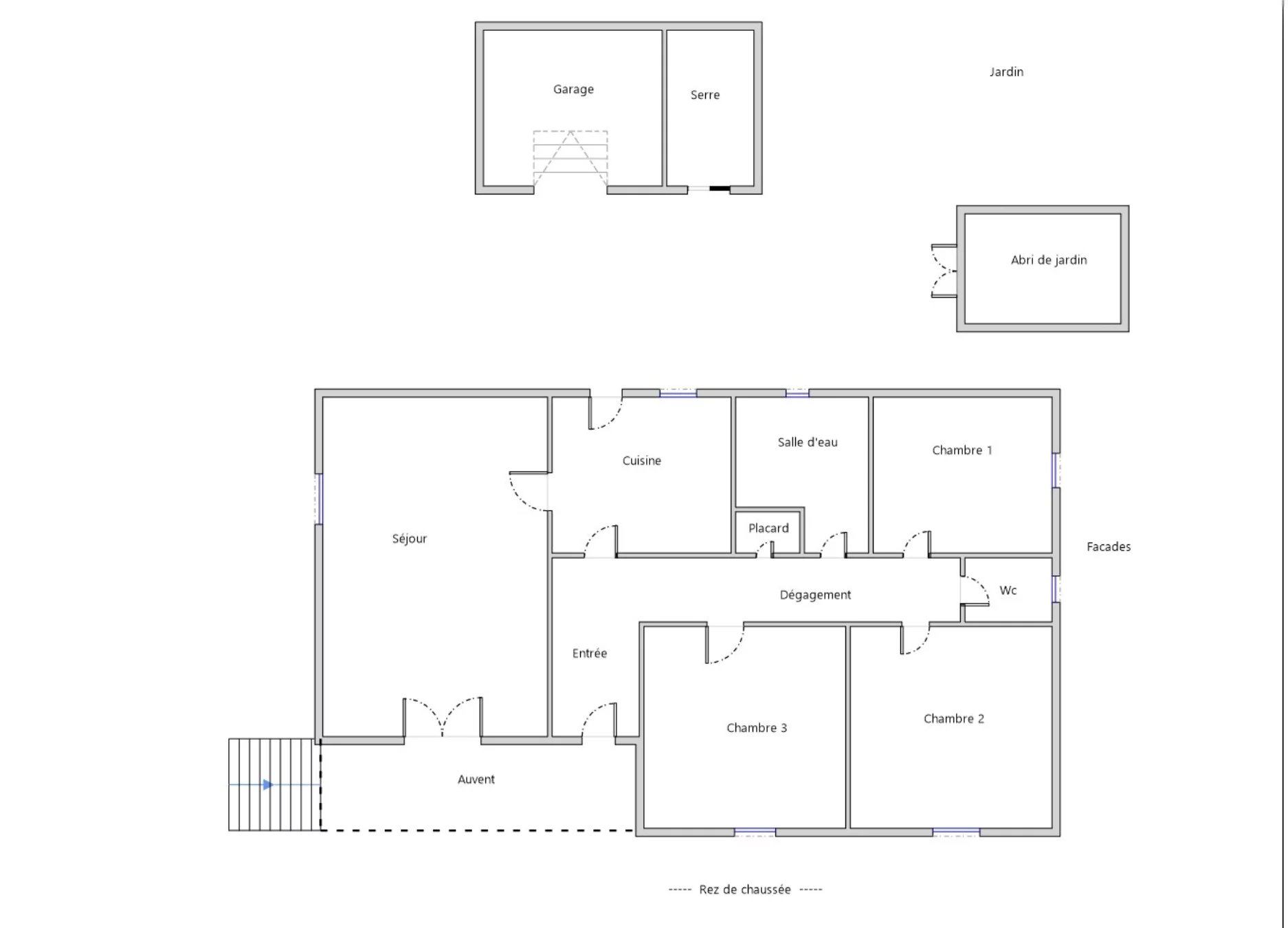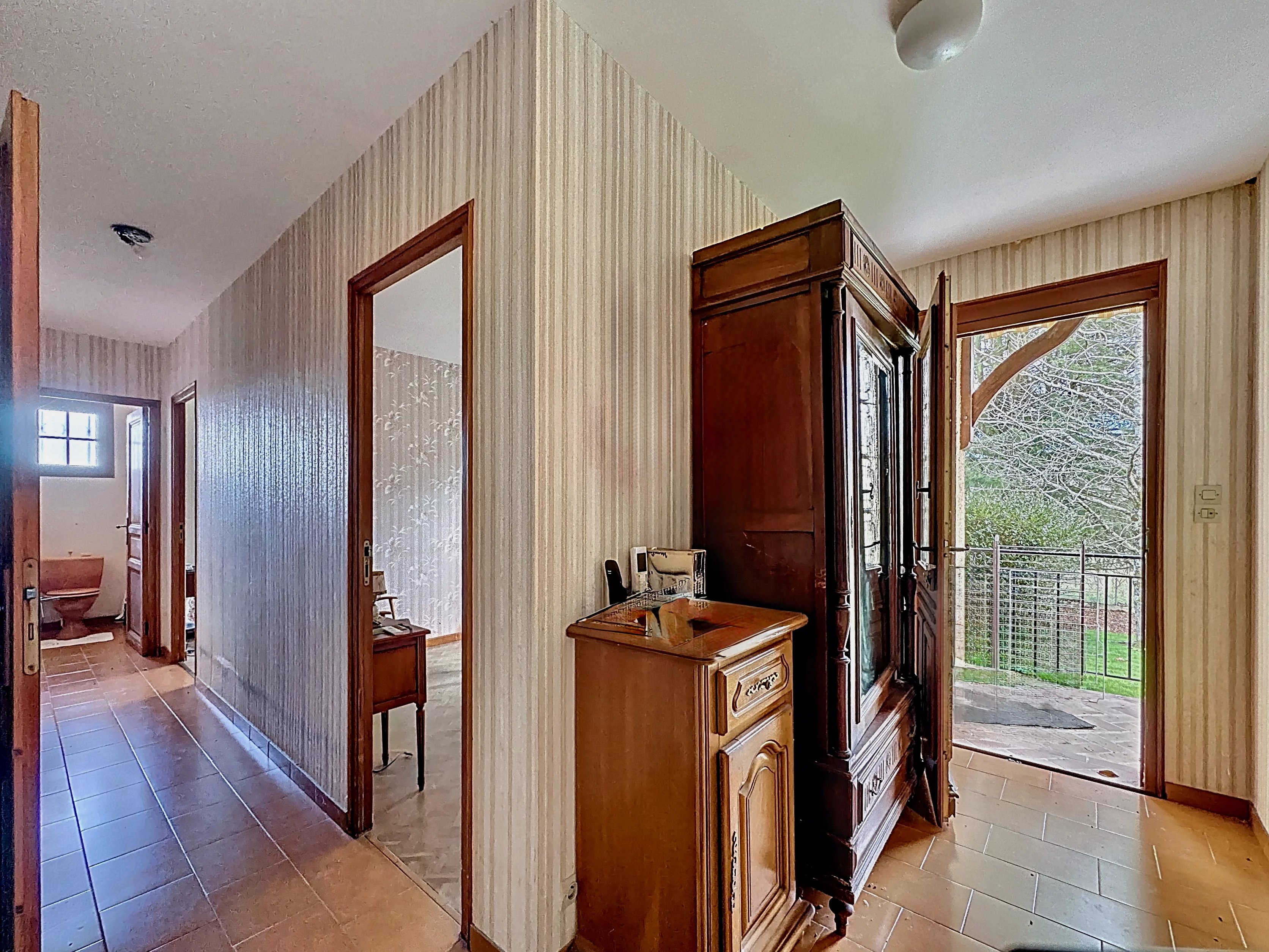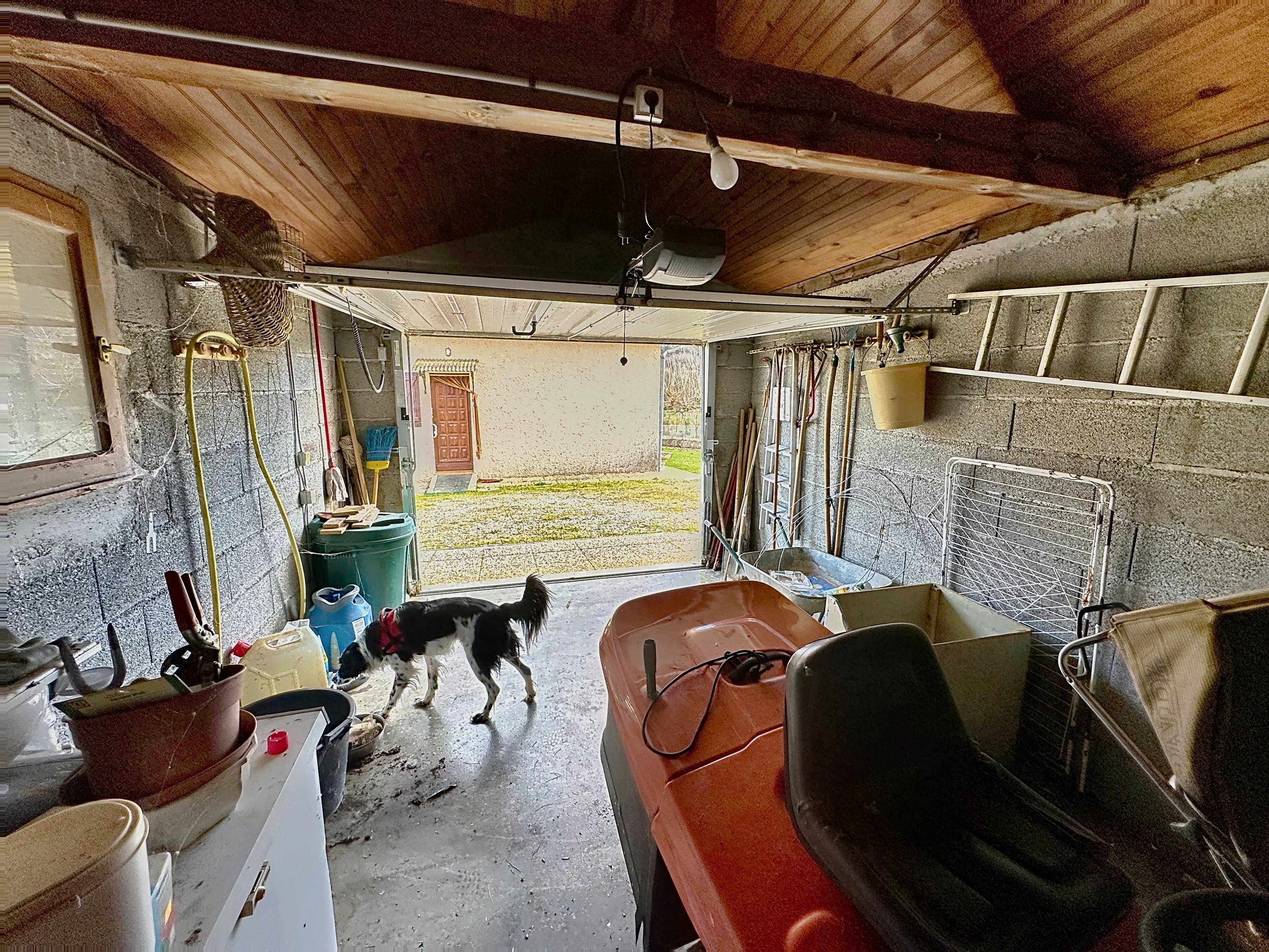 Ce garage fait face à la porte de la cuisine ce qui est pratique, mais la véritable entrée de la maison se situe côté Sud sous la petite terrasse qui donne également accès au grand séjour (26 m²)équipé d'un poêle à bois.