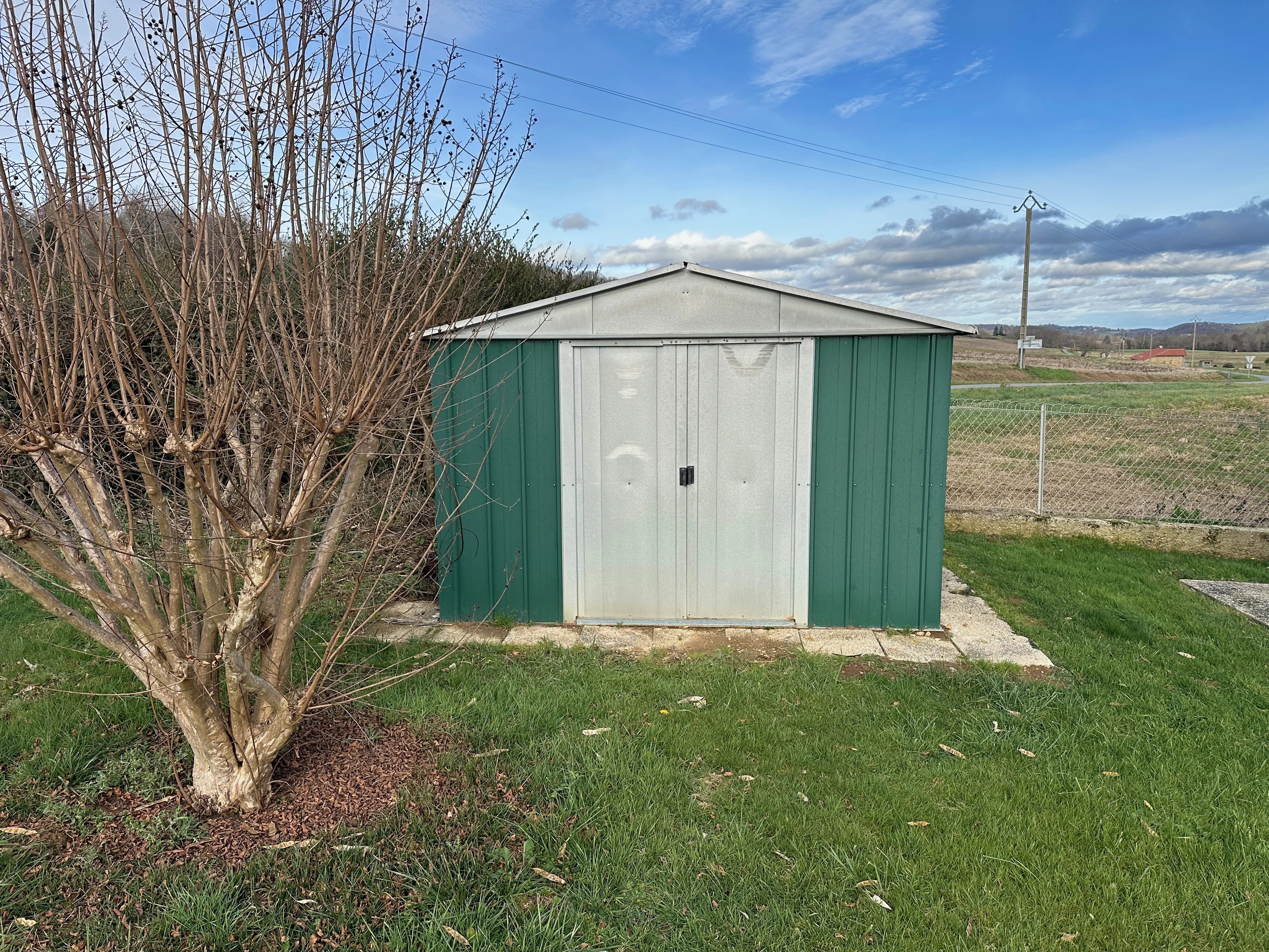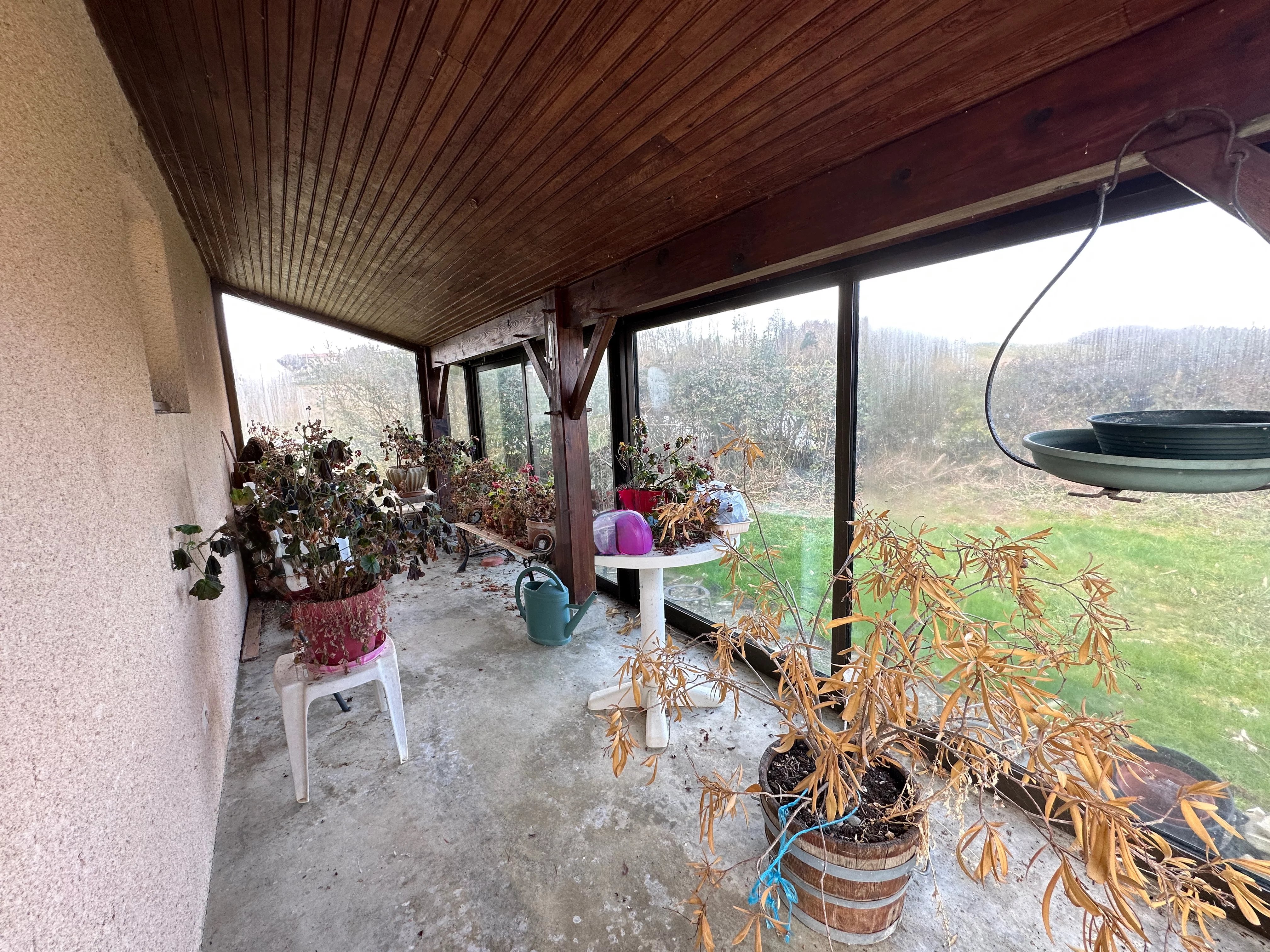 Vous entrez dans la propriété par un portail électrique qui vous permet d'arriver devant le garage à côté duquel se trouve une véranda de 10 m² qui tient lieu de serre actuellement.