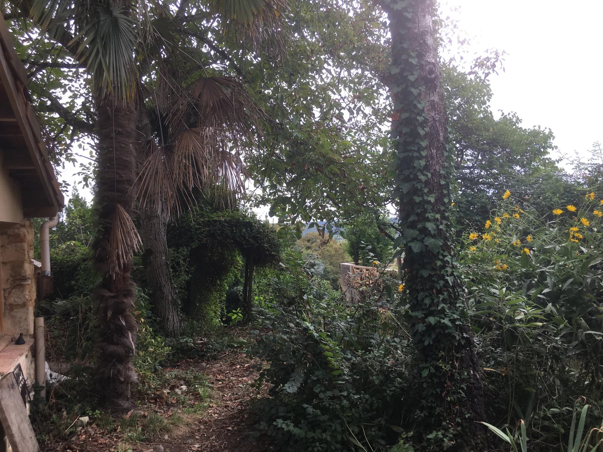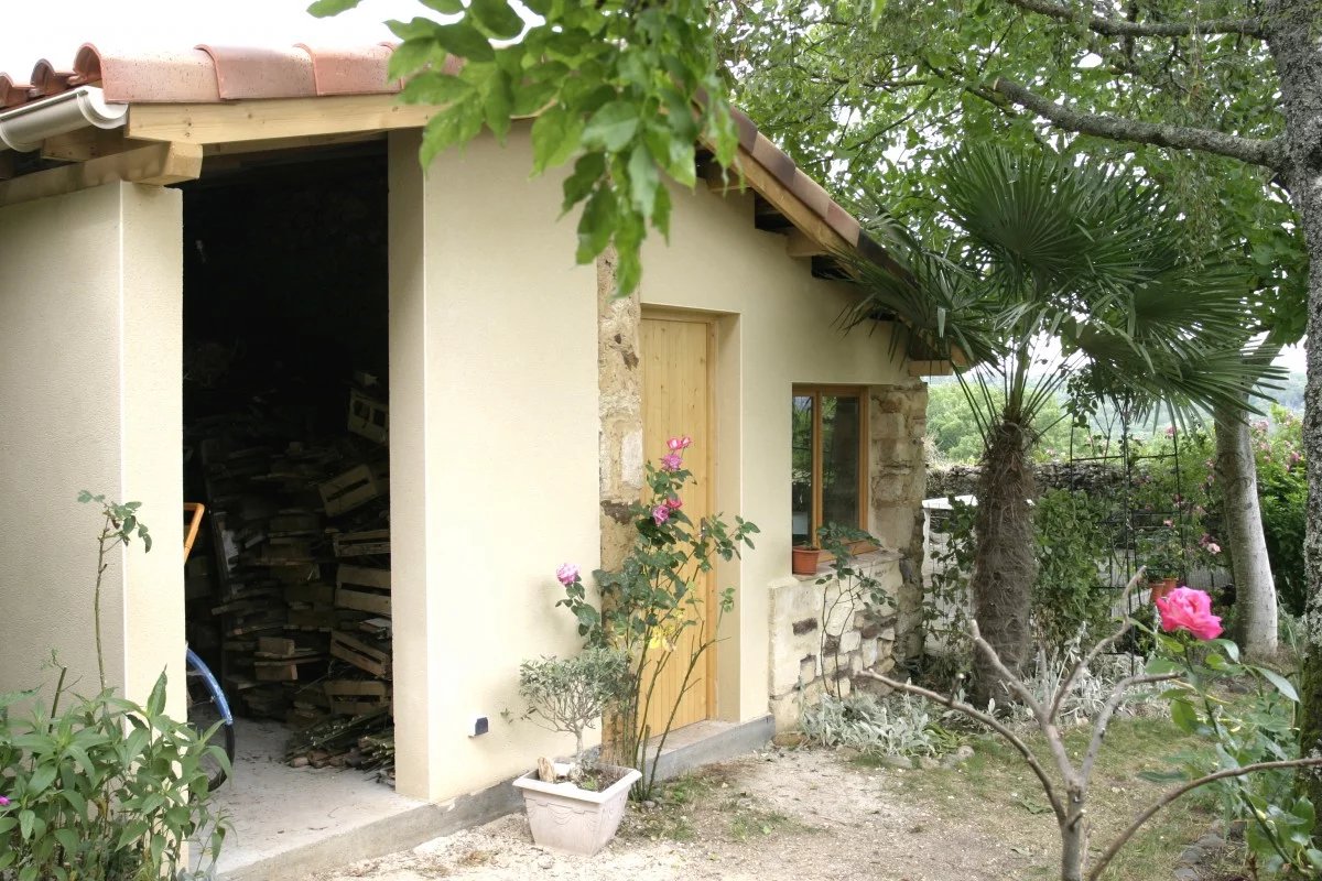 Le jardin en terrasse comprend un espace détente sur lequel est implanté un abri de jardin, un atelier de bricolage et un bûcher.