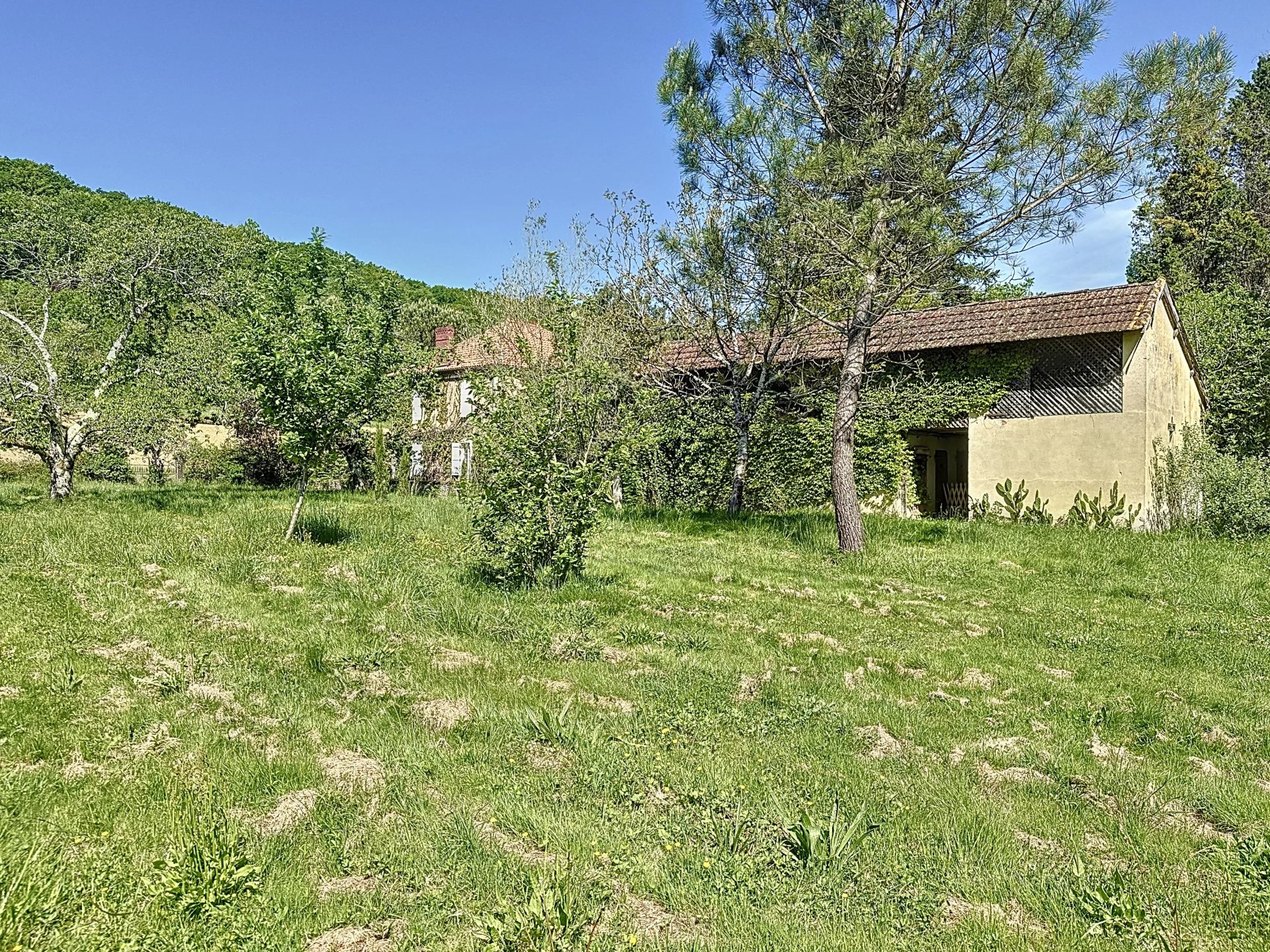Vous entrez par une belle porte en bois massif sur un spacieux hall qui dessert différentes pièces de vie: une salle à manger (de 18m²), un coin repas (17m²) ou siège une cheminée à foyer ouvert et une cuisine équipée (une porte donne accès aux dépendances et jardin), un grand salon (18m²) et une petit salon/bureau (17m²).