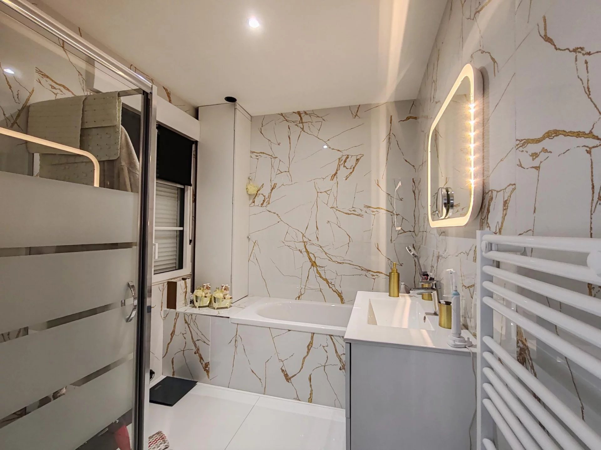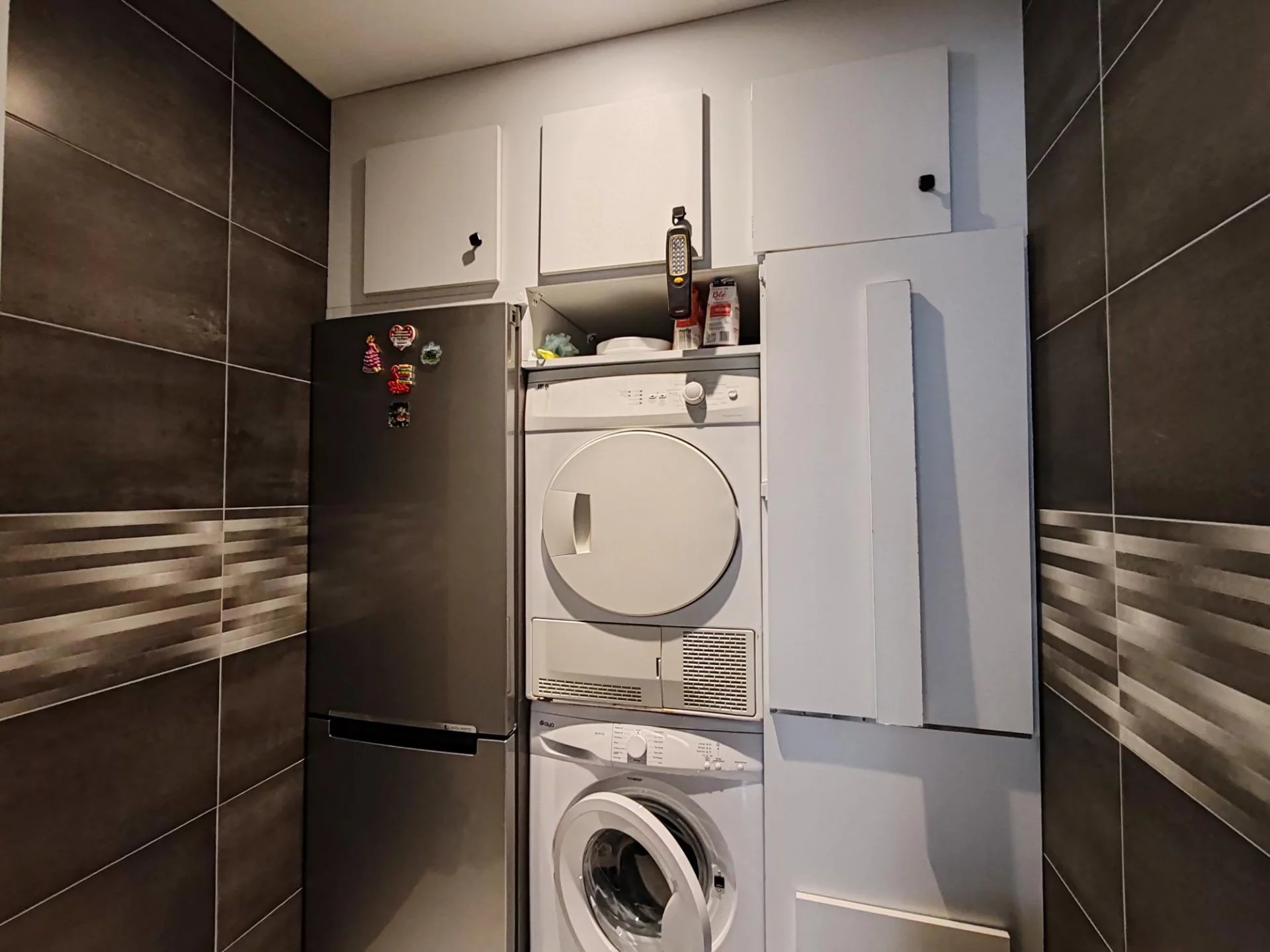 Séjour salon avec emplacement de cuisine, 1 chambre avec dressing, salle de bains + douche, wc, cellier