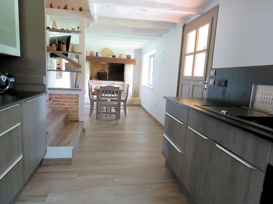La demeure principale d’environ 155 m² propose au rez-de-chaussée une entrée chaleureuse, un salon, une salle à manger lumineuse avec poêle à bois, une cuisine avec terrasse et chambre avec salle de bain.