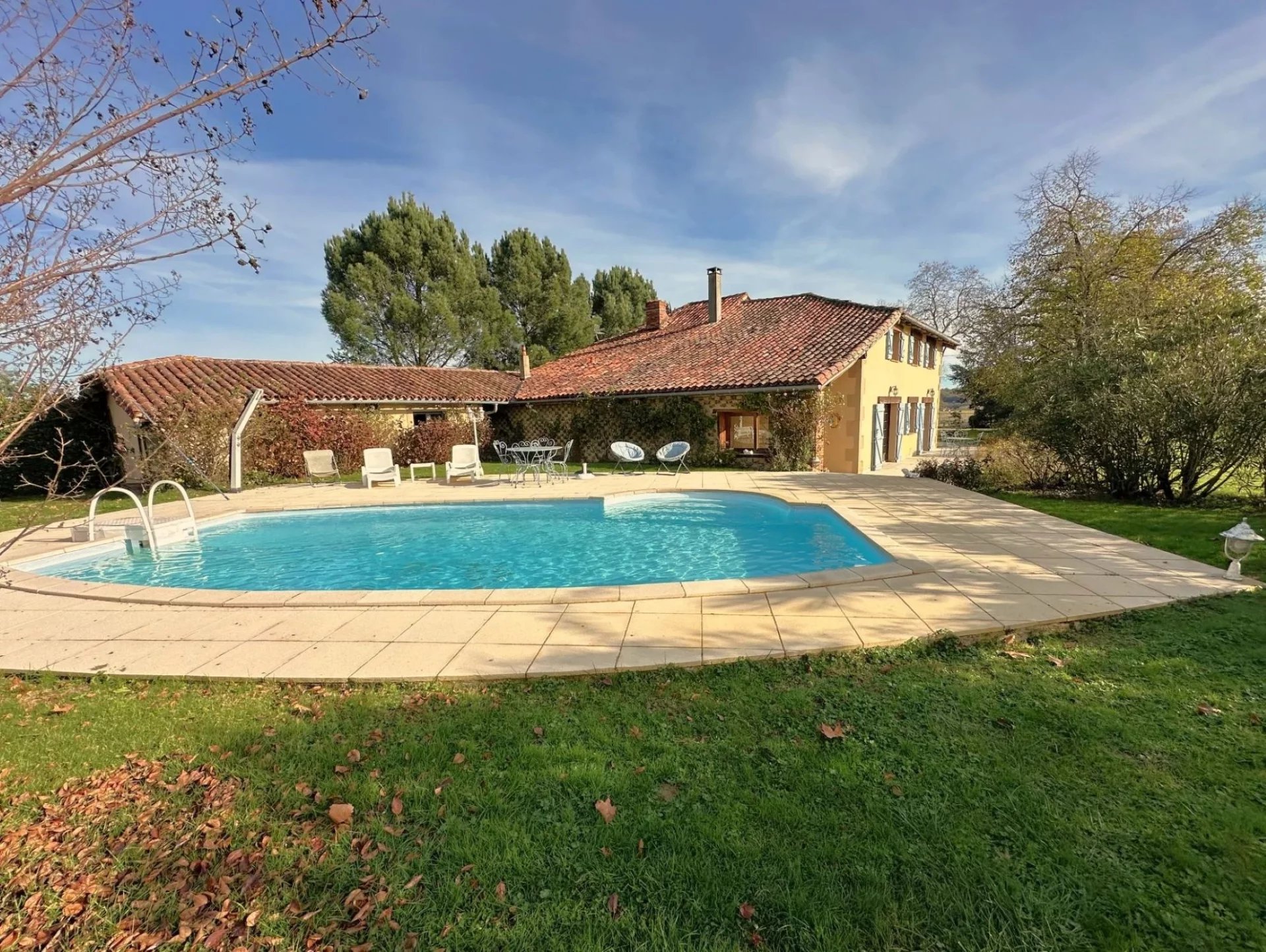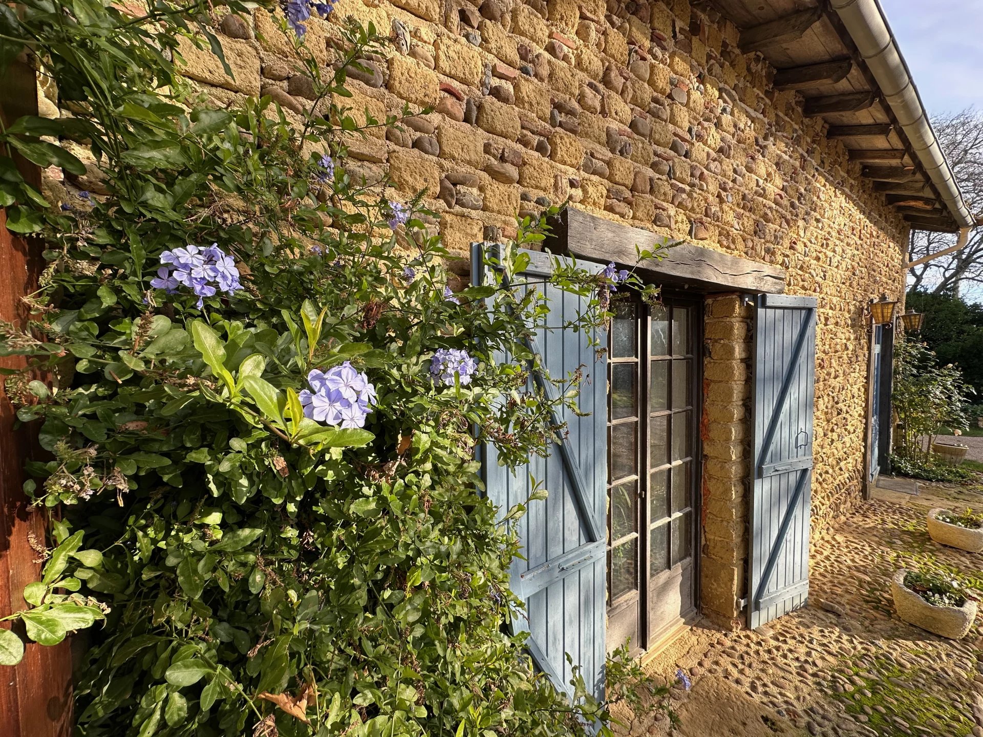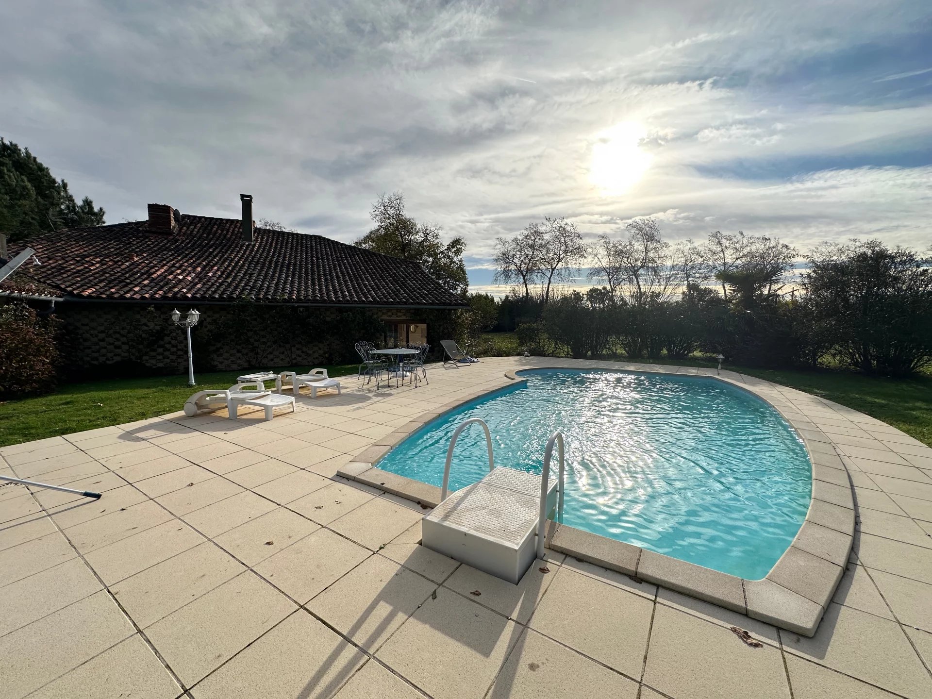 Het terrein van meer dan 7000 m² is beplant met fruitbomen, rozen, hortensia's en bloemen. Er is een zwembad omzoomd door een terras met uitzicht op de Pyreneeën.