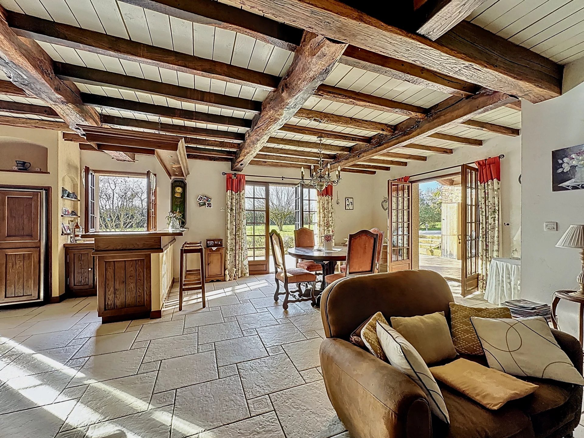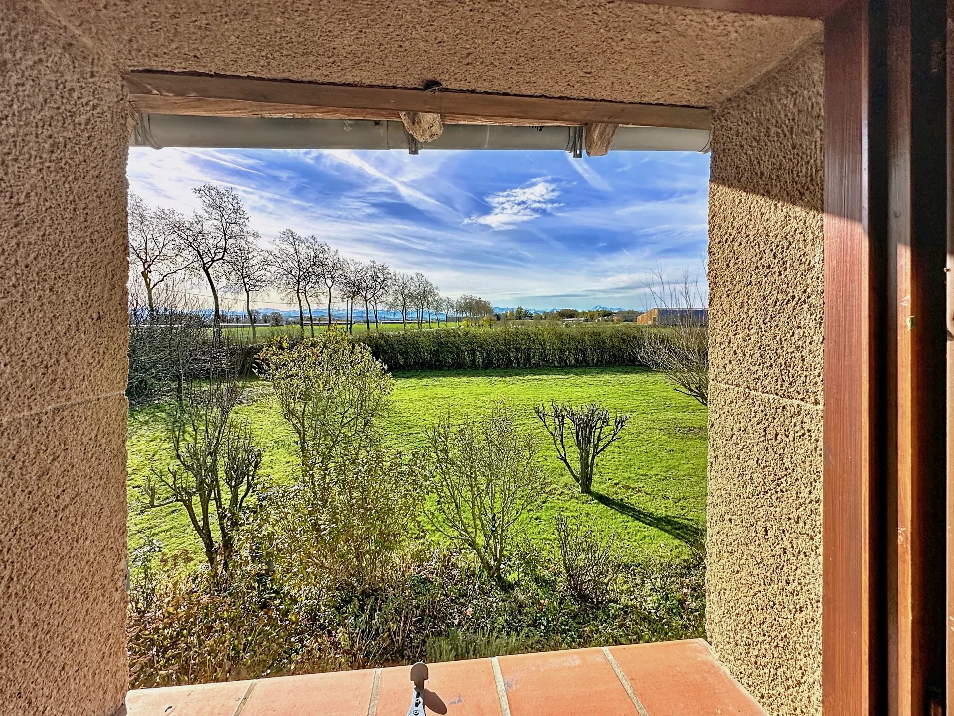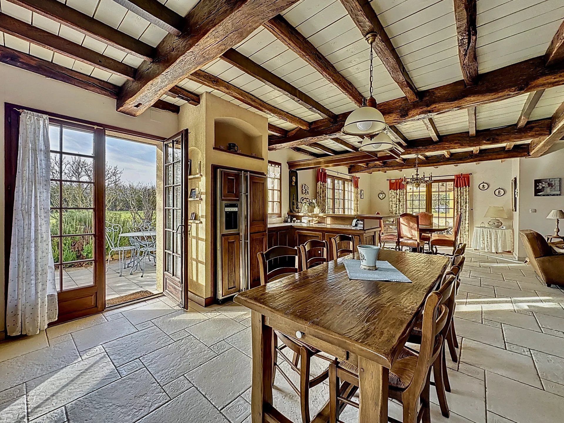 Aan de ene kant geniet je van een zeer lichte woonkamer van 65 m2 die gedeeld wordt door de woonkamer en de keuken. 3 openslaande deuren geven je toegang tot verschillende terrassen met uitzicht op de Pyreneeën. Deze woonkamer is voorzien van vloerverwarming.