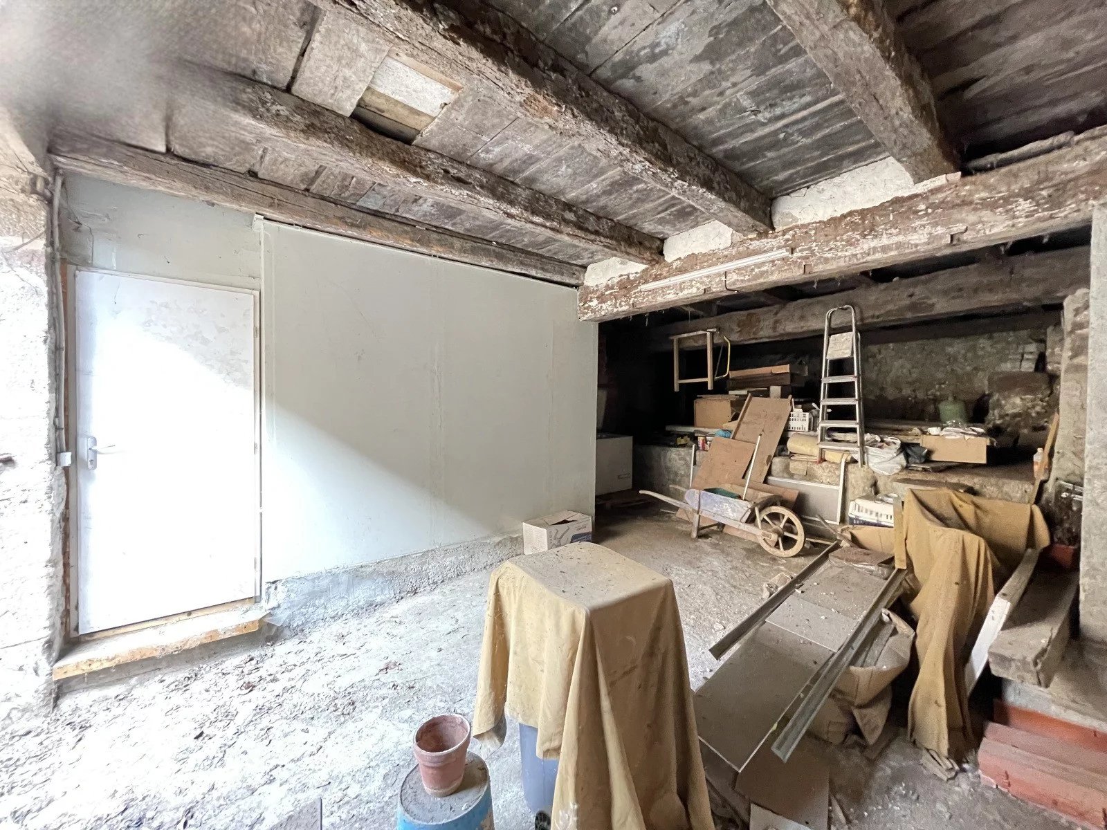 Begane grond: entree, keuken/eetkamer (oude open haard), doucheruimte, wc, aangebouwde garage van 65 m2, kelder van 23 m2.