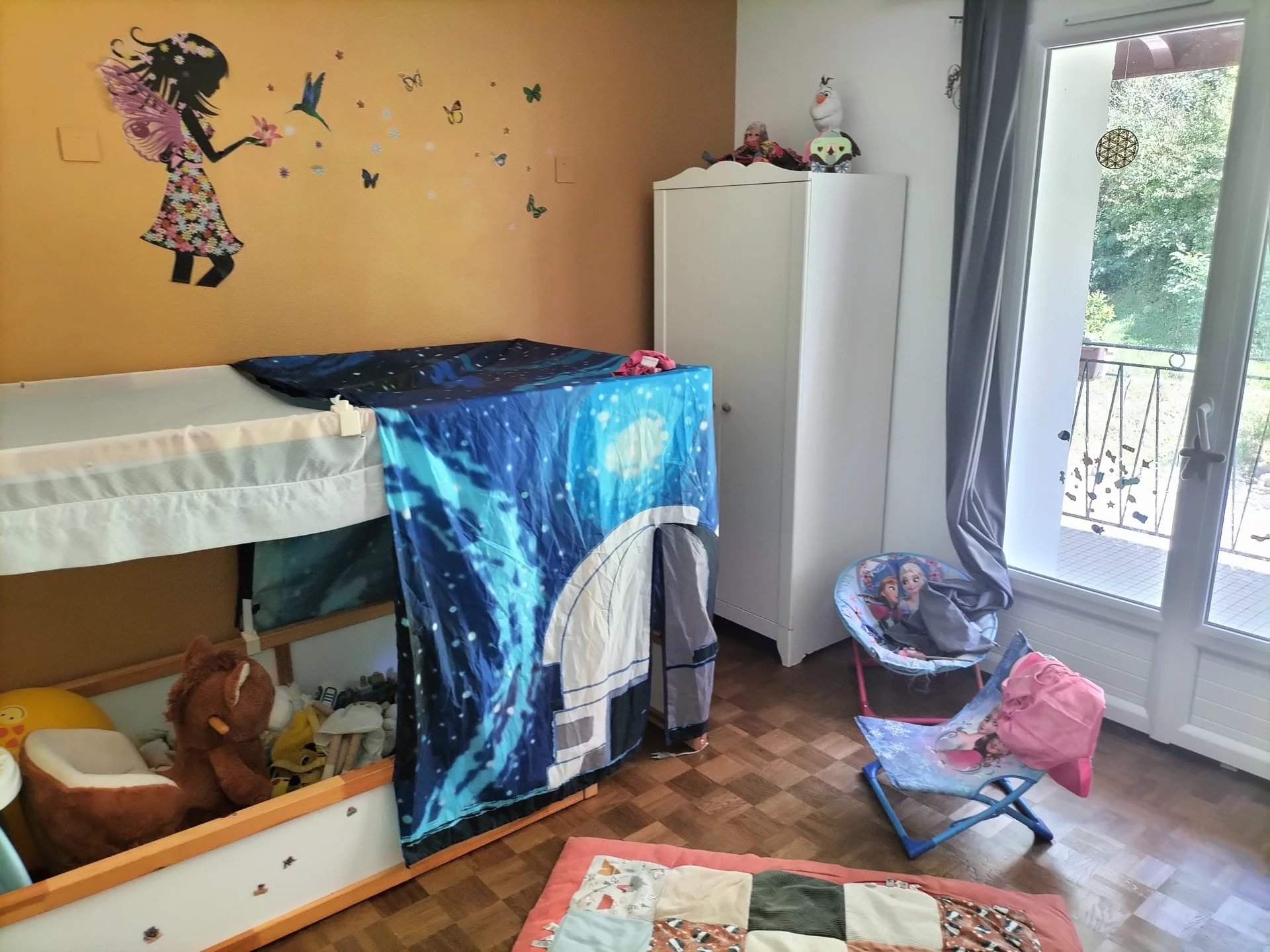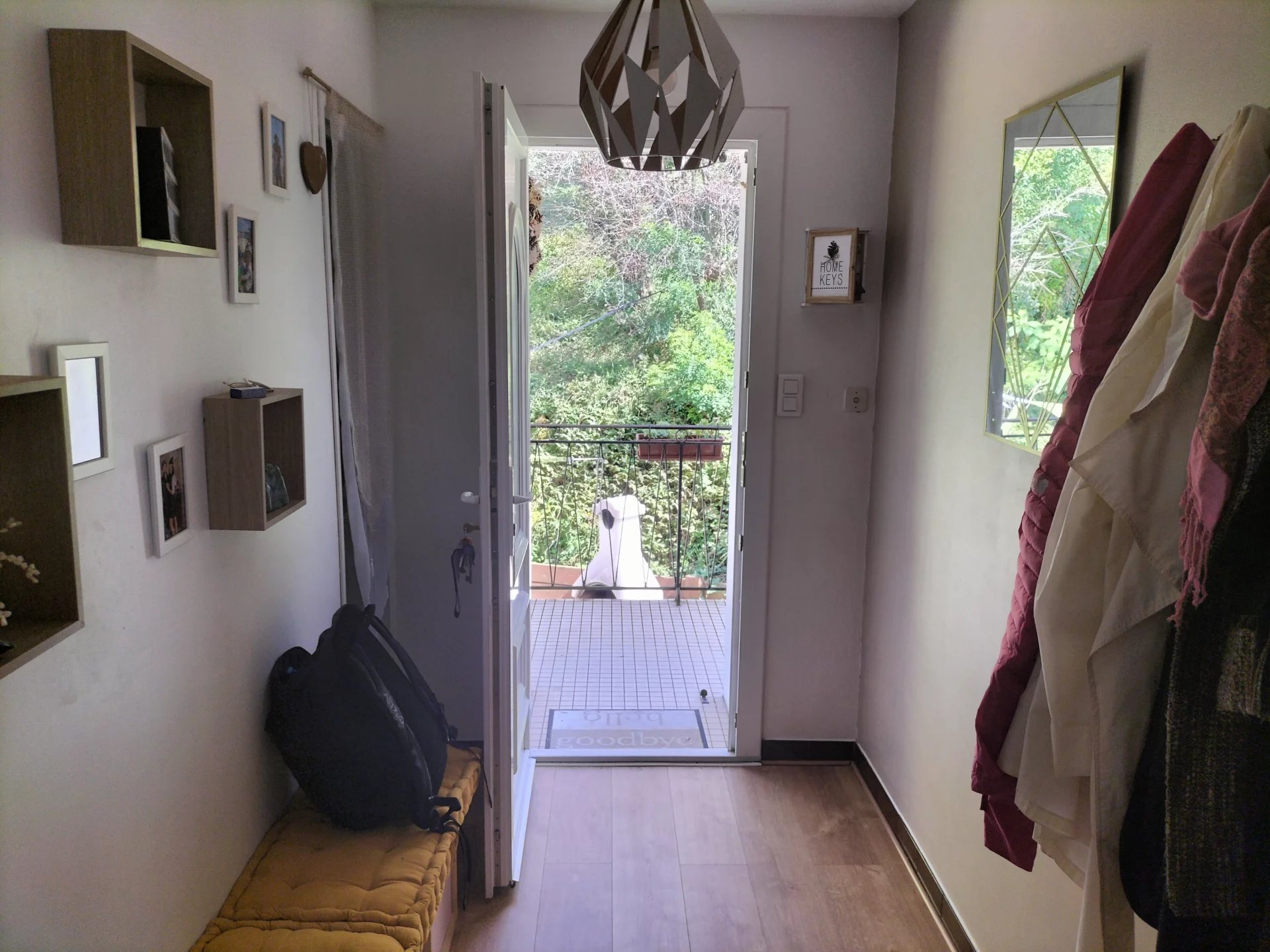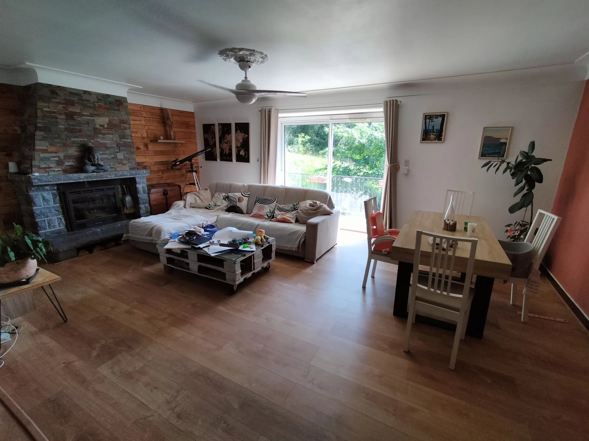 De centrale hal geeft toegang tot alle delen van de woning . Aan de linkerkant ligt een grote woonkamer van 45 m² (salon, eetkamer, open keuken) met een mooie open haard met inzethaard die op het zuiden uitkomt op een zonnig balkon. De badkamer (8 m²) en het toilet grenzen hieraan.