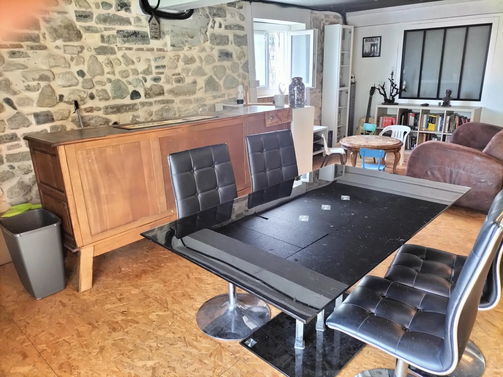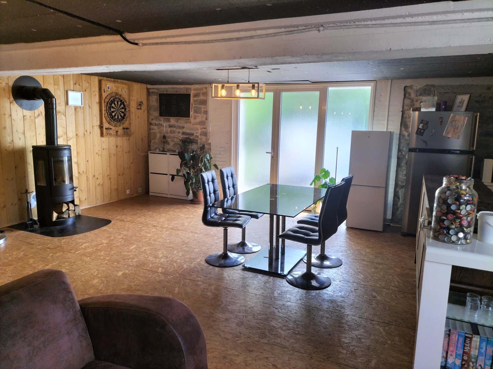 Op de begane grond vindt u een ruime zaal (51 m²) die verlicht wordt door een grote glazen schuifdeur op het zuiden (bij de 1e ingang van het pand). Het is voorzien van een prachtige muur met zichtbare stenen, verwarmd door een houtkachel, en ingericht om familie en vrienden te ontvangen tijdens gezellige bijeenkomsten: zithoeken, eetruimte, bar..